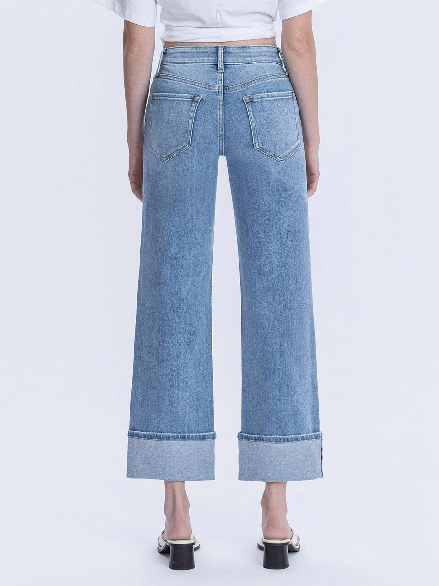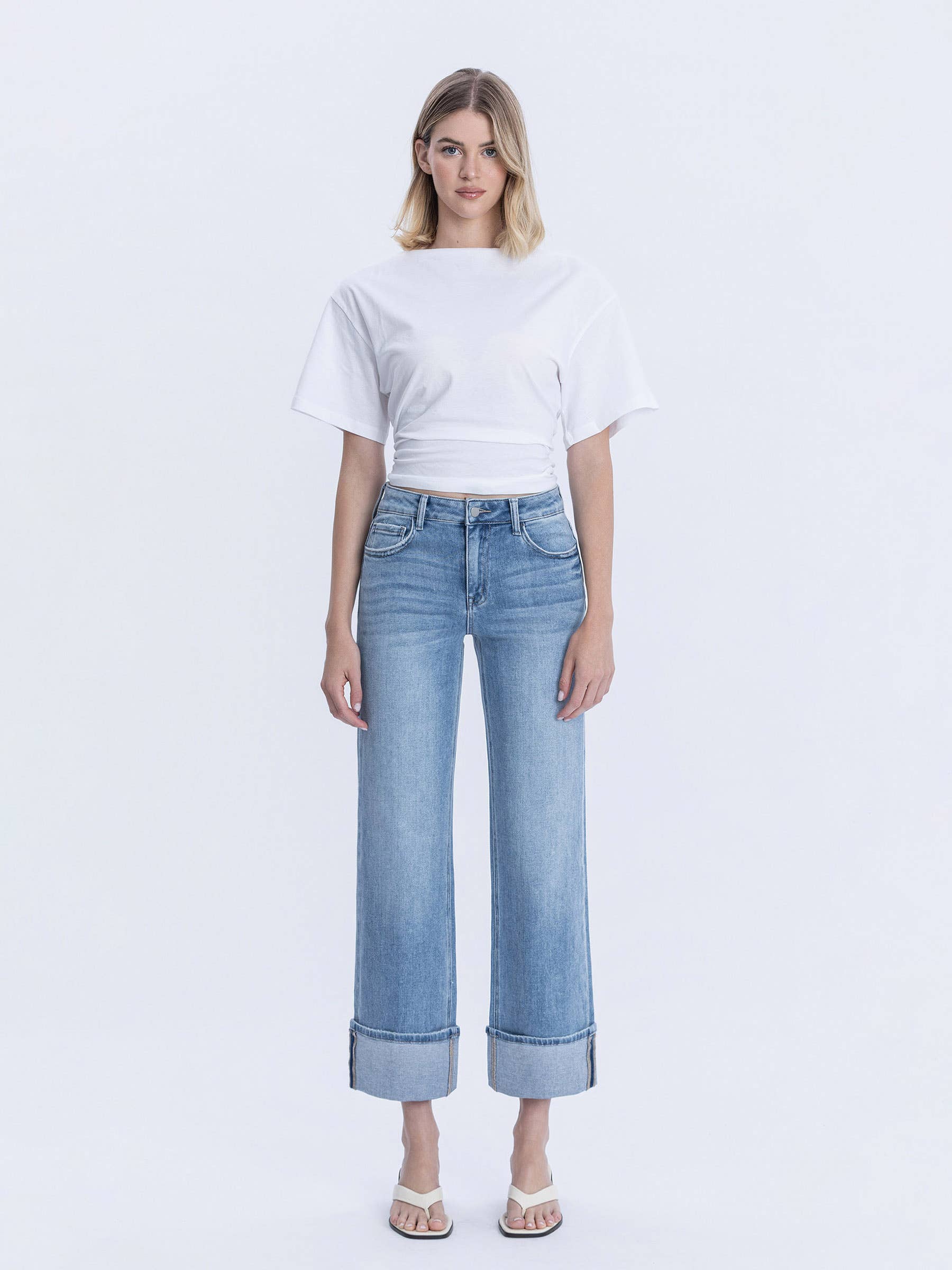 HIGH RISE MEDIUM LIGHT WASH CUFFED SLIM WIDE JEANS COMFORT STRETCH DENIM, HIGH RISE WAIST, 5 POCKETS, SINGLE CUFF HEM, ANKLE LENGTH, MEDIUM LIGHT WASH, SLIM WIDE JEANS F.