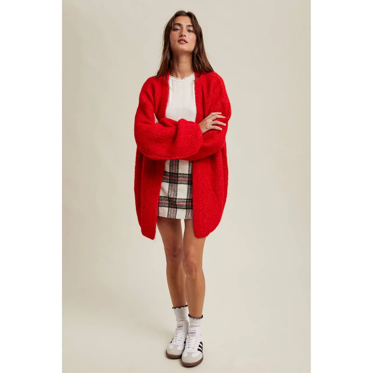 The Brushed Plaid Mini Skirt combines classic plaid with a soft, brushed texture for a cozy yet stylish look. Perfect for pairing with sweaters or tees for a chic, everyday outfit or the holidays.