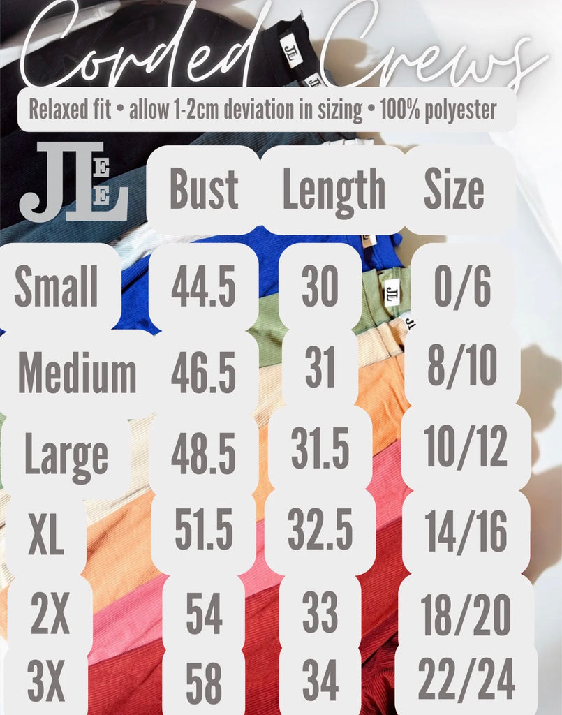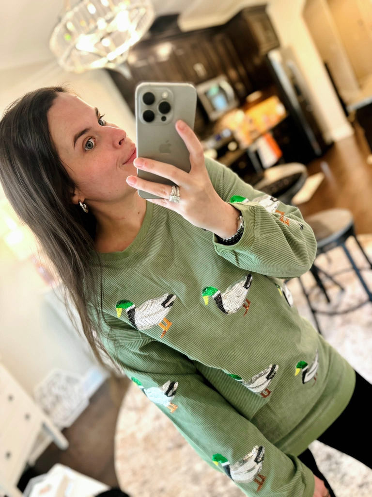 This corded crew with sequin mallard ducks is SO cute! These crews are super high quality as well. Sizes S-3XL.