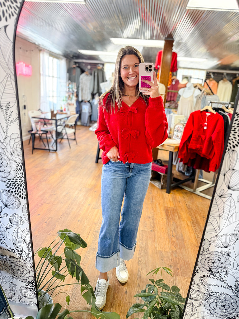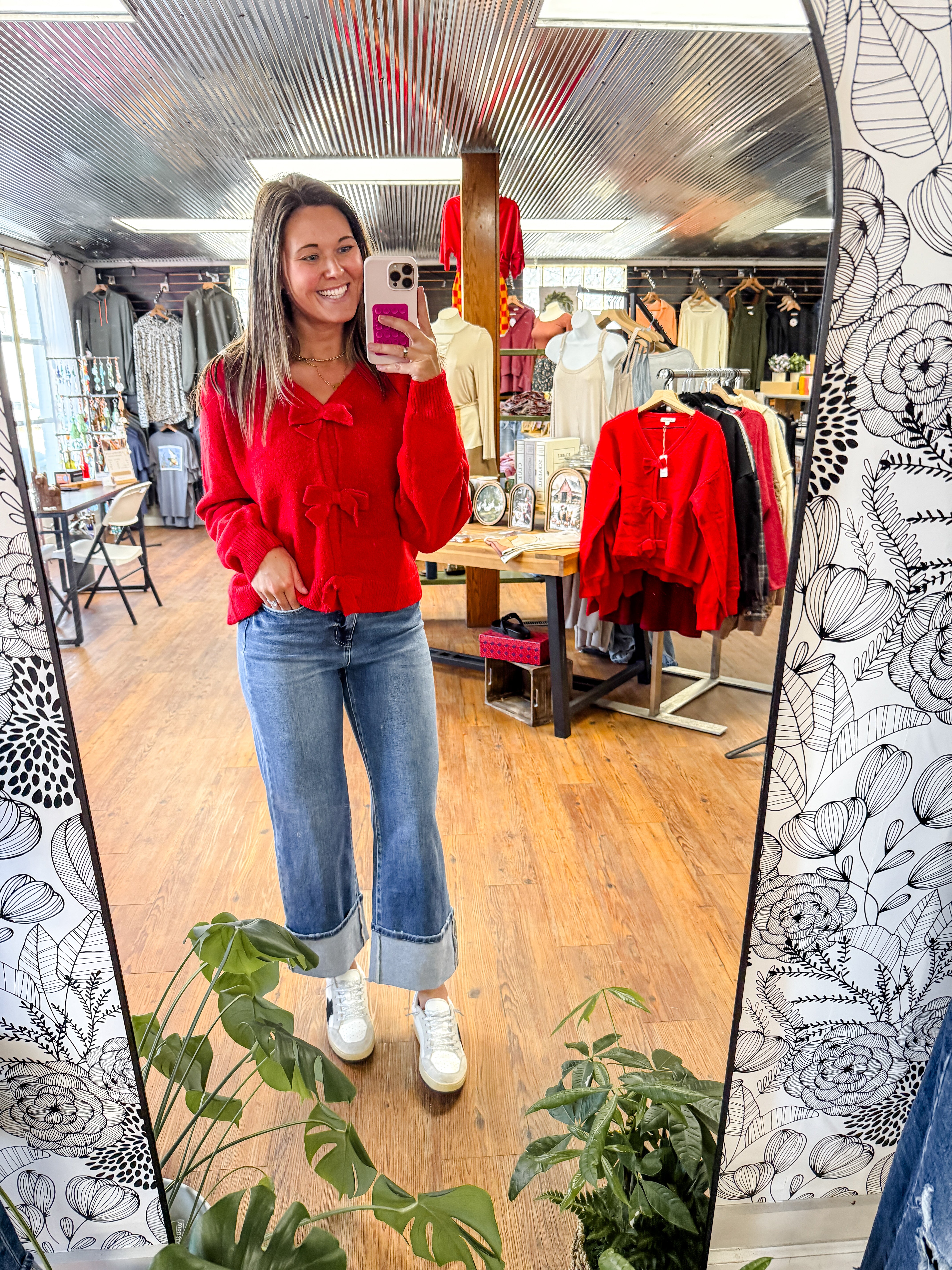 Introducing the Red Bow Sweater, the perfect addition to your winter wardrobe. This cozy sweater features a stylish red bow detail and button snap closure to wear closed or open as a cardigan.